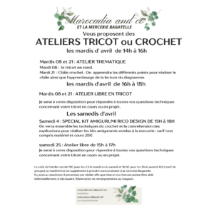 En avril, vous retrouverez aussi les ateliers à la mercerie Bagatelle à Ploërmel . Beaucoup d’atelier libre pour vous aidez à finir vos encours et être à votre disposition pour commencer ou voir ensemble des techniques qui vont vous permettre de réaliser de nouveaux projets plus printanier.