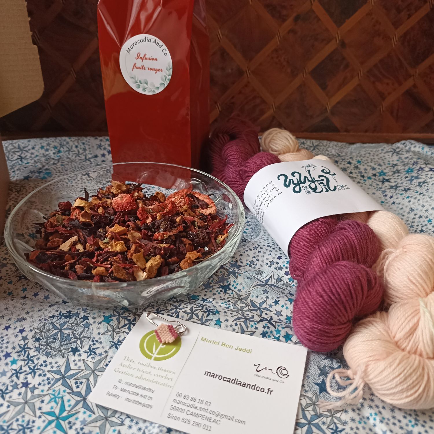 je vous présente les superbes chaussettes de Lysandre : Les chaussettes fleurs de rosée. Full jacquard avec un talon travaillé en jacquard également. beaucoup de douceur et de contraste. j’ai choisi 2 couleurs chez Lyly sur un fil qui me parlaient bien dans ce sens : le velours et la rosée du matin . J y ai associé une infusion de fruits rouges légèrement acidulée avec les fleurs d hibiscus et malgré tout bien équilibrée avec les aromes de fraises. le kit est à retrouver ici