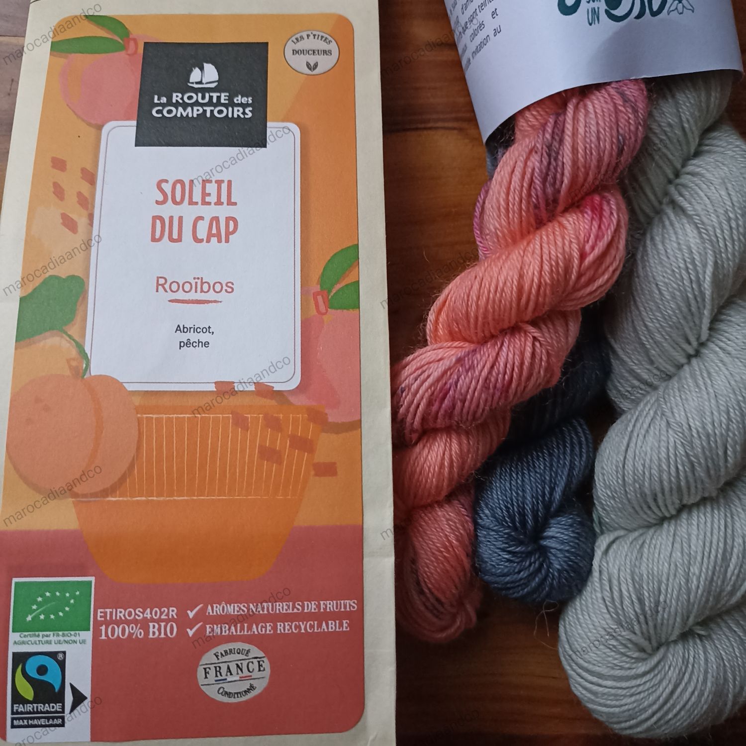 Rooibos d’Afrique du sud* (78%), dés de (abricot* (8%), mangue*), aromes naturels de (abricots*(2.5%),pêche* (2%), mangue*), pétales de soucis.