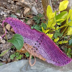 C ‘est un châle triangulaire au point mousse, qui se tricote de la pointe vers l’infini, de la racine vers l’univers. En faisant des augmentations sur l’endroit avec une maille centrale qui est la colonne vertébrale qui doit être bien alignée.