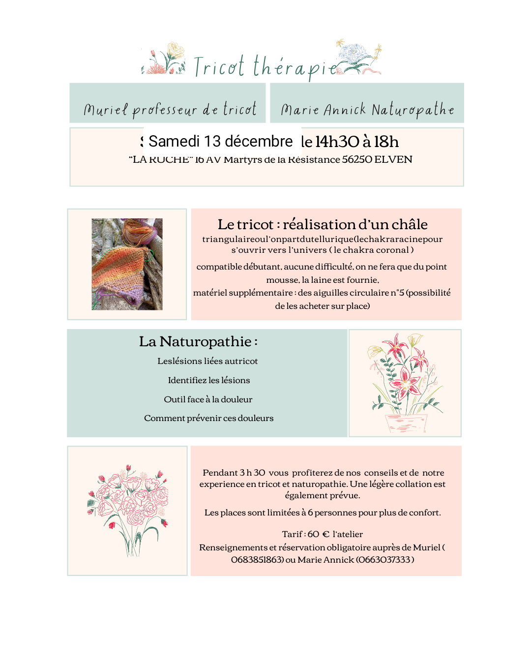 Avec Marie Annick, naturopathe à Nelson naturopathie qui vous apprendra à prendre soin de vous pendant le tricotage, à avoir les bonnes postures,